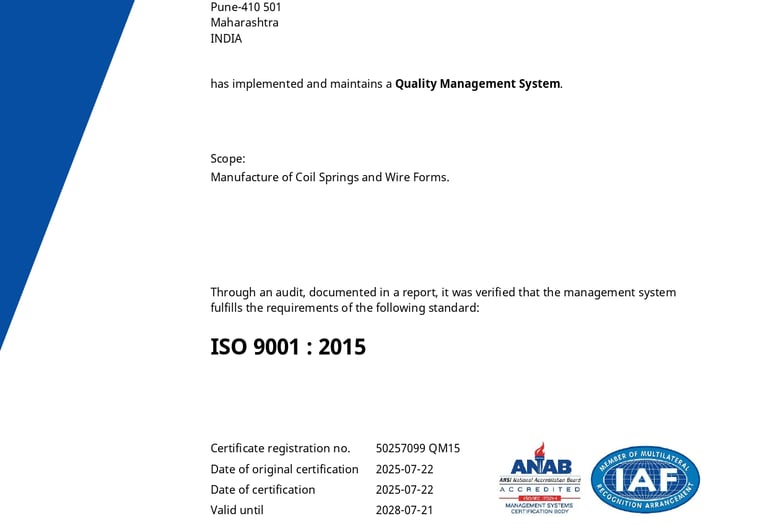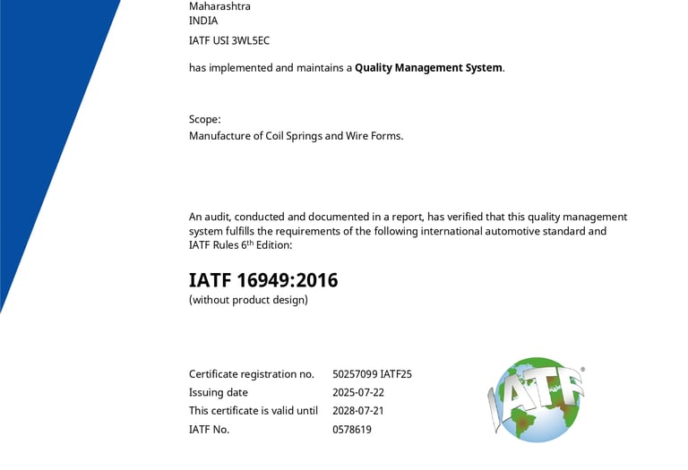 SRSONS Springs India Pvt Ltd proudly holds prestigious international quality management certifications, including ISO-9001:2015 and IATF 16949:2016, validating our excellence in manufacturing premium helical coil springs and wire forms. These globally recognized certifications demonstrate our unwavering commitment to superior quality standards, rigorous quality control processes, and continuous improvement. As a certified spring manufacturer in India, we deliver automotive-grade springs, ISO-certified wire forms, IATF-compliant coil springs, and quality-assured precision components that meet the most demanding international specifications for automotive, industrial, and specialized applications.